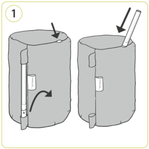1. Du kannst dies gut alleine erledigen, am besten geht es aber zu zweit. Fülle das Kissen an einem Ort nach, wo du eventuell austretende Kügelchen leicht wegsaugen kannst. Entnehme das Röhrchen aus der Halterung und stecke es in die Öffnung an der Naht der Nachfüllpackung. Achte darauf, dass du das Röhrchen nur bis zur Markierung einführst.