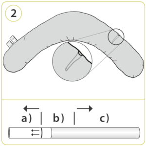 2. Die Nachfüllöffnung am Stillkissen-Inlett befindet sich gegenüber der Waschetiketten an der Außennaht. Hinweis für „alte“ Kissen mit Reißverschluss-Nachfüllöffnung: Öffnen Sie den Reißverschluss nur so weit, dass das Röhrchen durchpasst. Hierbei können jedoch leichter Perlen entweichen.